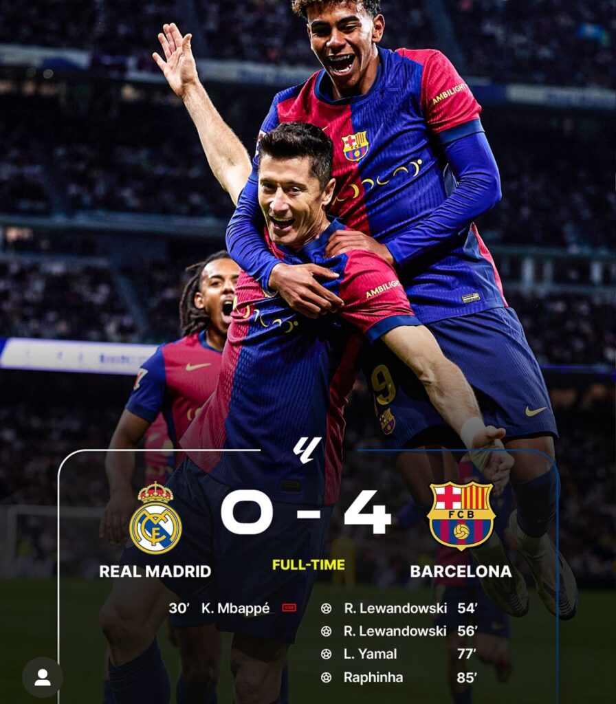 C’est à la 54e minute que Robert Lewandowski a ouvert le score, marquant le début de la fin pour les Madrilènes. Deux minutes plus tard, à la 56e, l’attaquant polonais signait un doublé, anéantissant les espoirs adverses. Barcelone, loin de se contenter de cette avance, continuait d’attaquer sans relâche, chaque offensive étant une nouvelle occasion de briller. À la 78e minute, Yamal ajoutait une touche de génie avec un chef-d’œuvre pour le 3-0, illuminant la soirée barcelonaise d’un éclat particulier. Enfin, Raphinha scellait la victoire avec un quatrième but à la 84e minute, concluant ainsi l’humiliation totale des Madrilènes.