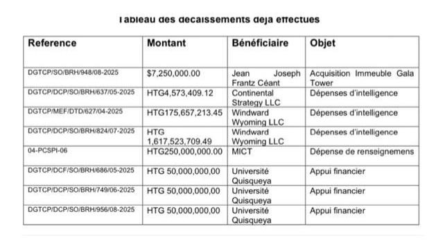 Selon le tableau analysé par la FJKL dans son rapport du 4 mars 2026, ces fonds ont été décaissés en trois tranches de 50 millions de gourdes chacune au cours de l’année 2025. L’octroi a été effectué sous l’administration du Premier ministre Alix Didier Fils-Aimé et de l’ancien ministre de l’Économie et des Finances Alfred Fils Métellus.