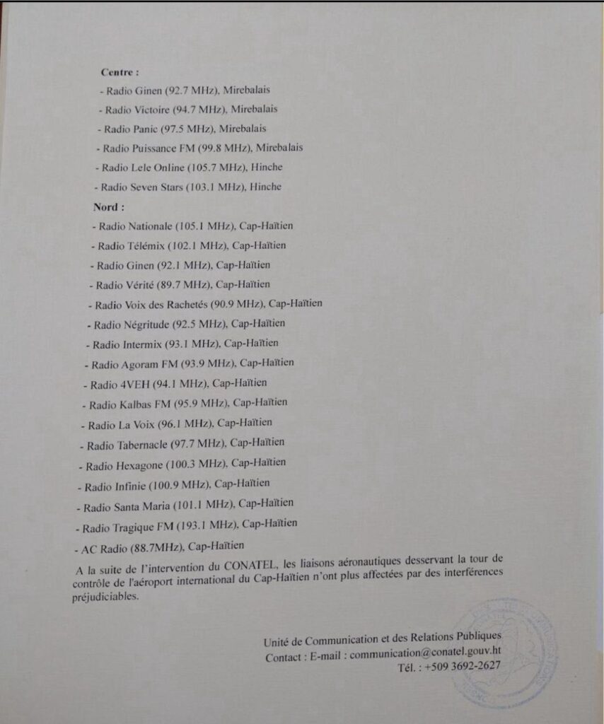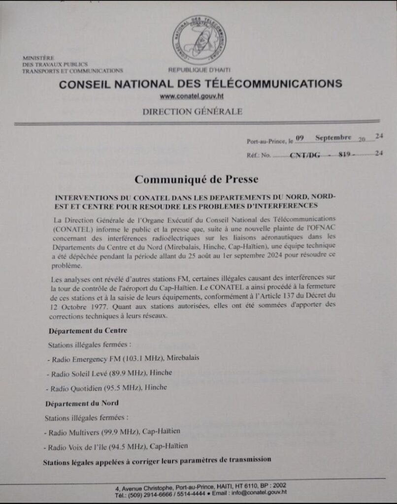 Le CONATEL a identifié cinq stations illégales comme étant à l’origine de ces perturbations. Ces radios fonctionnaient sans licence et empiétaient sur les bandes de fréquence réservées à d’autres usages essentiels. Parmi elles, on compte Radio Multivers (99.9 MHz) et Radio Voix de l’île (94.5 MHz) au Cap-Haïtien, ainsi que Radio Emergency FM (103.1 MHz), Radio Soleil Levé (89.9 MHz) et Radio Quotidien (95.5 MHz) dans le département du Centre.