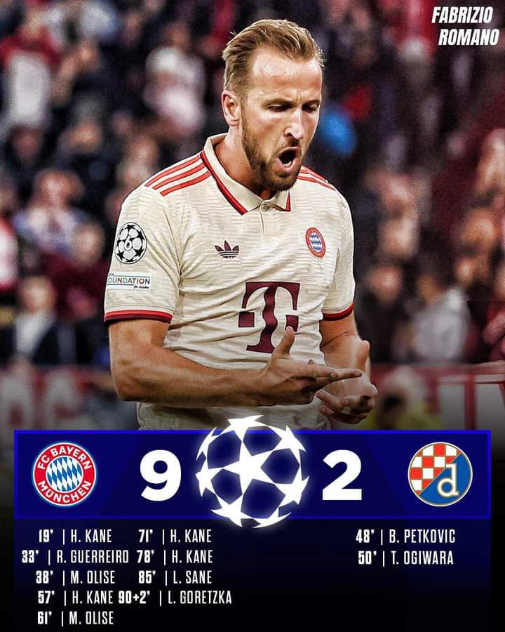 Le Bayern Munich a véritablement explosé pour sa première sortie européenne avec un festival offensif. Harry Kane a inscrit un quadruplé, portant son équipe vers une victoire écrasante contre le Dinamo Zagreb.