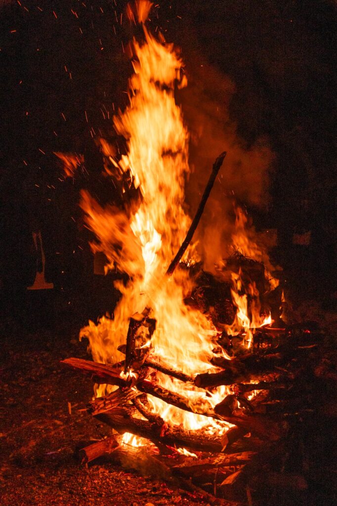 Moment fort de la soirée : l’embrasement du feu de la Saint-Jean, précédé d’un rituel chargé de symboles. Les membres de la Loge ont tracé au sol un pentacle de lumière composé de cercles concentriques, de mots sacrés tels que le Tétragrammaton, de noms hébraïques et angéliques, ainsi que du nom Yohanan, équivalent hébraïque de Jean.