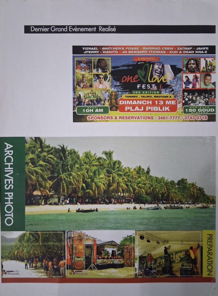 Après avoir réalisé plusieurs événements majeurs en Haïti comme « Selebre Champèt Ayiti », Showbeez a aussi réalisé quatre éditions de concerts et festivals tels que « Still Alive » (concert de commémoration de la mort de Bob Marley à « Le Villate Club » et au Wahoo Bay Beach Hotel) ou encore quatre éditions de « ONE LOVE FEST ». Par ailleurs, Showbeez a aussi participé au lancement de DJ Nal au carnaval de Delmas et de Pétion-Ville.
