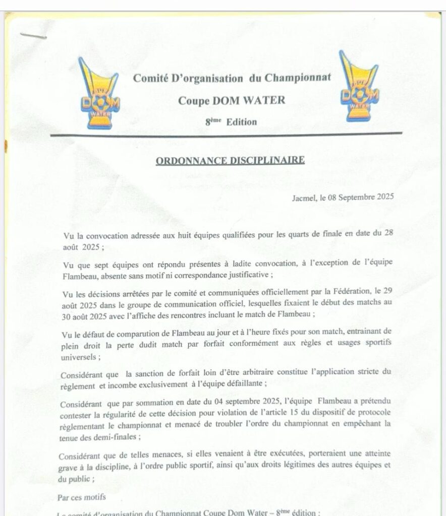 Malgré une sommation déposée par l’équipe de Flambeau, le comité d’organisation de la Coupe DOM WATER a confirmé, par une ordonnance disciplinaire datée du 8 septembre 2025, la défaite par forfait du club pour non-comparution le 30 août et a maintenu la poursuite du championnat selon le calendrier prévu. Le document met également le club en demeure de ne pas perturber les demi-finales, sous peine de sanctions aggravées pouvant aller jusqu’à l’exclusion des prochaines éditions.