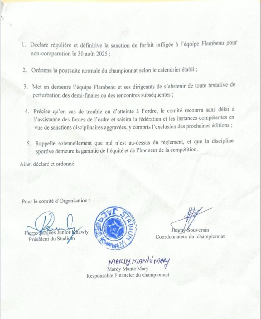 En pratique, le tableau des demi-finales se poursuit sans Flambeau, tandis que le club annonce envisager d’autres voies de recours. L’ordonnance porte les signatures de Pierre-Jacques Junior Khawly (président du Stadium), Jimmy Souverain (coordonnateur du championnat) et Mardy Manté Mary (responsable financier).